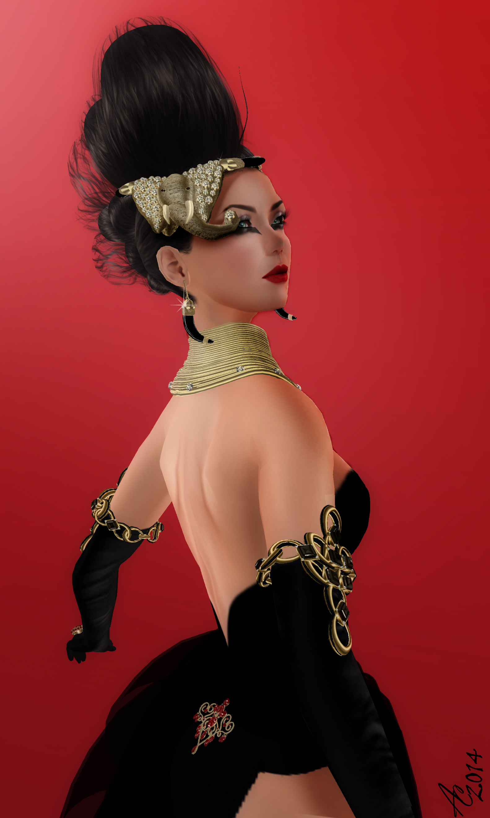 The stunning Samhain necklace compliments the headpiece and the Rocinate’s Curve and make-up by Nuuna Lyre adds an exotic African tribal flair to the look. Small details, like the splash of red in the Visions of Sugarplums ring and the sexy little ruby La Brooch Derriere add interesting contrast.