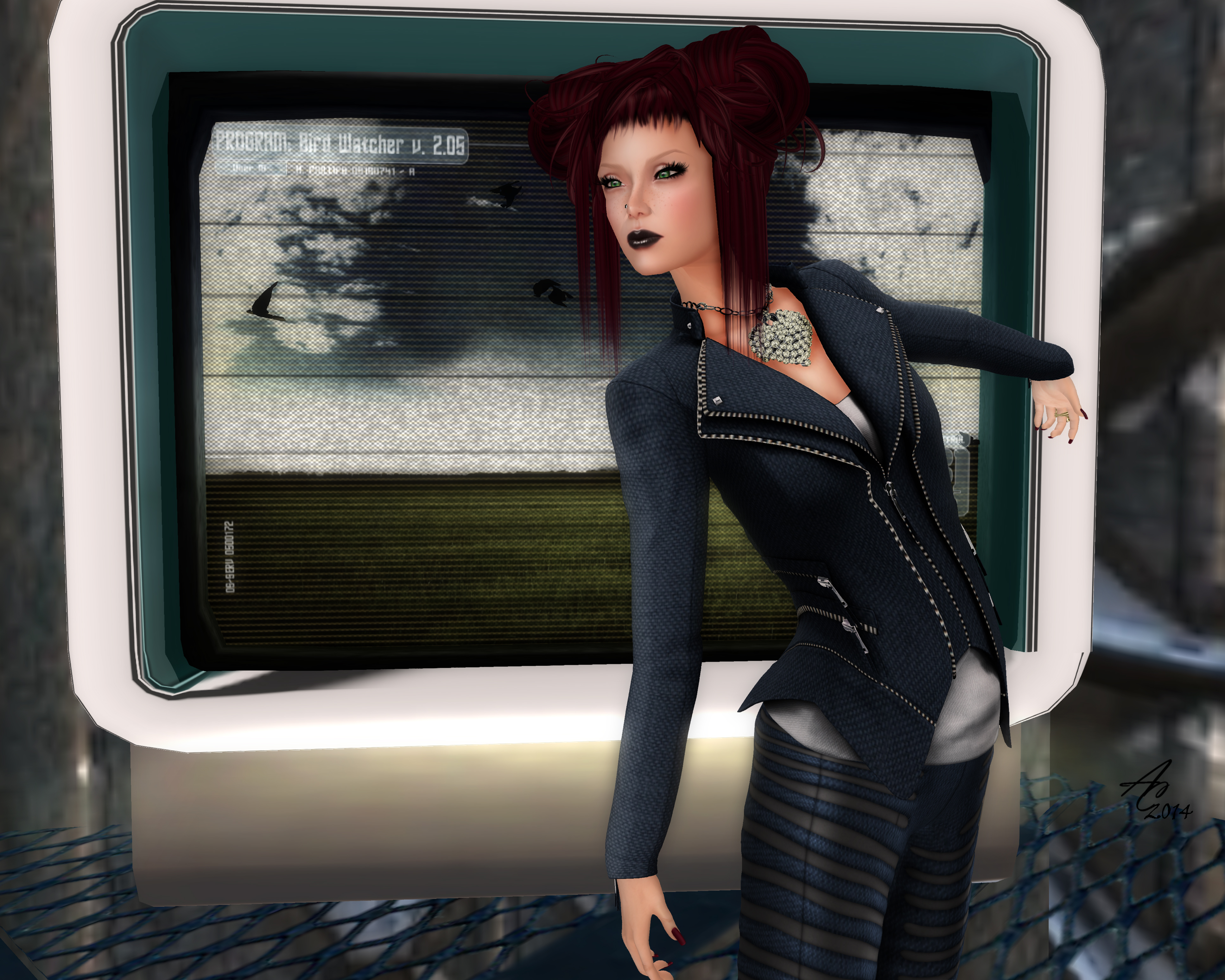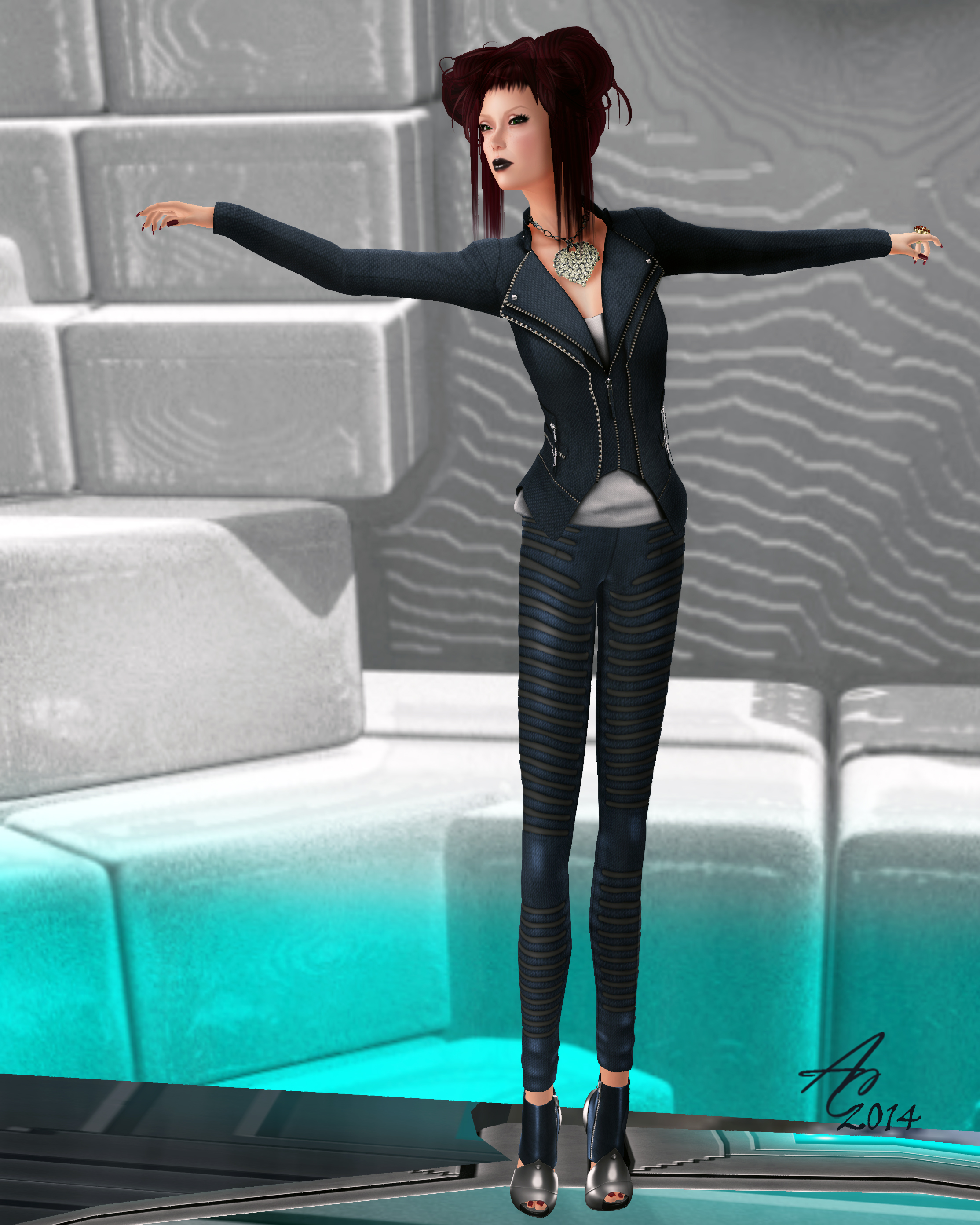 I shot these photos at a cool new SIME (well it’s new to me), called Blade Runner City. I was really impressed with how well designed this futuristic-themed sim is and thought it was the perfect place to photograph this futuristic chic outfit. Check it out–the architecture and attention to details of this sim are amazing!