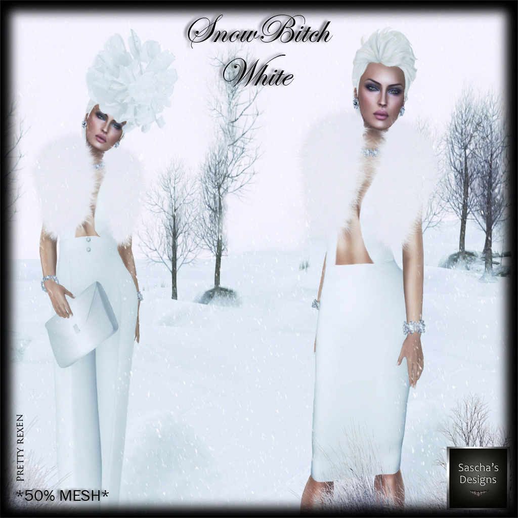 I’m having so much fun mixing and matching my clothes from Sascha’s Designs. In this ensemble, I’ve taken the military-style jacket from the above Fifth Avenue set and am wearing it with the high-waisted pants from the stunning white “Snow Bitch” set.