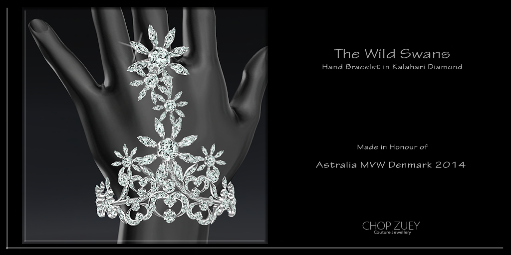 The versatility of Saschas Designs and Chop Zuey are limited only by your imagination. In the following photo, I’ve taken the elegant winter gown and coat called “Neige” from Sascha’s Designs and added a dramatic mystical flair to the look with antlers from Boudior. The dazzling tiara, hand bracelet and diamond necklace is from Chop Zuey’s The Wild Swans collection. Notice how it shimmers and stands out–truly a breathtaking set.
