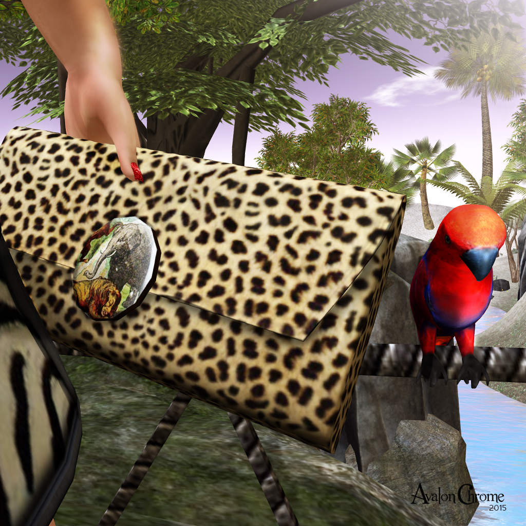 With the intention of going full-out in animal prints (faux hides of course, because real would just be cruel!). I put on this most amazing and incredibly detailed zebra dress called, “Elsa” from Sweet Temptations. Then keeping in theme, I put on my “Asphyxia” leopard print heels (Reign) and grabbed my “Cheetah” clutch (Aushka & Co.). (What??? Doesn’t everyone wear high heels a clutch purse on jungle safaris?)