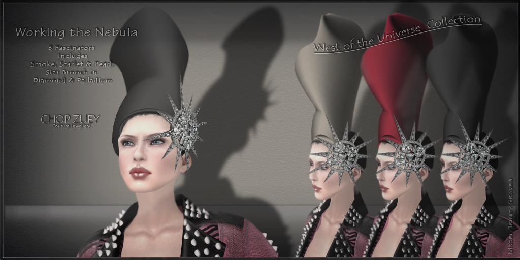 I’m wearing the scarlet “Working the Nebula” fascinator that features this absolutely gorgeous “Star Pin”.
