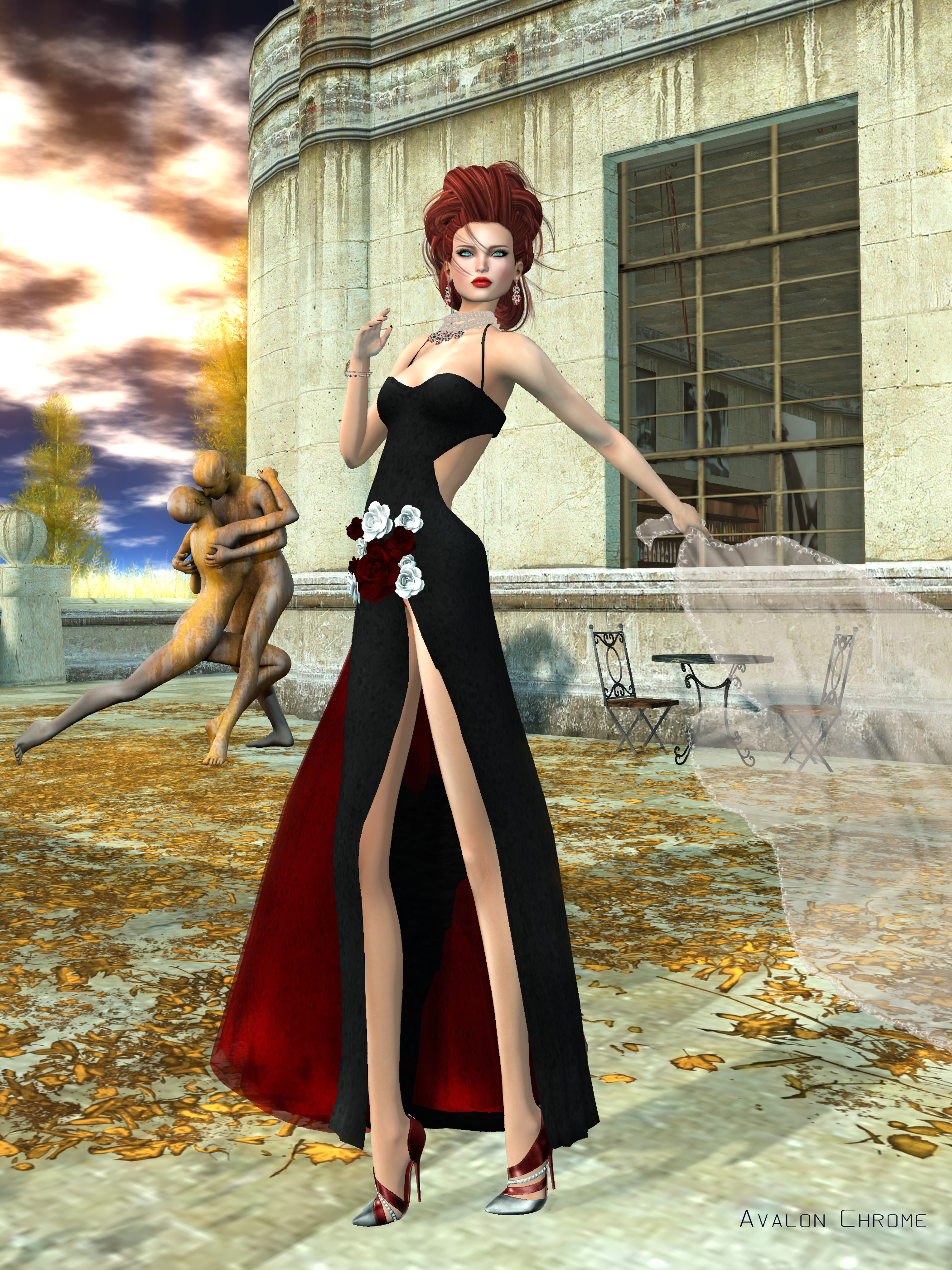 When I’m looking for chic elegance, I head straight to Sascha Designs and today was no exception. I found this sexy and stylish dress called “Giselle” and loved it so much, I bought two of them! I got the red and black versions and combined them. I’m wearing the Giselle black dress with the hip flowers and the split fluff skirt from the red version of the gown.