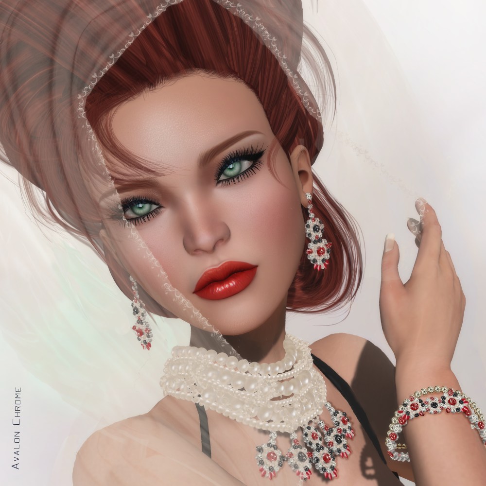 We needed a girls’ night out so Starr and I decided to get decked out in elegance with our favorite designers: Chop Zuey Couture Jewellery and Sascha Designs. Our version of a “night out” starts with dressing up and doing a photoshoot. So donned in our most elegant garments, we stepped into my photo studio and shot the close-ups. Then we went over to Ocho Tango Place, Blossom Land, which is one of the most impressive and creatively built sims I’ve seen and we shot the rest of the photos.