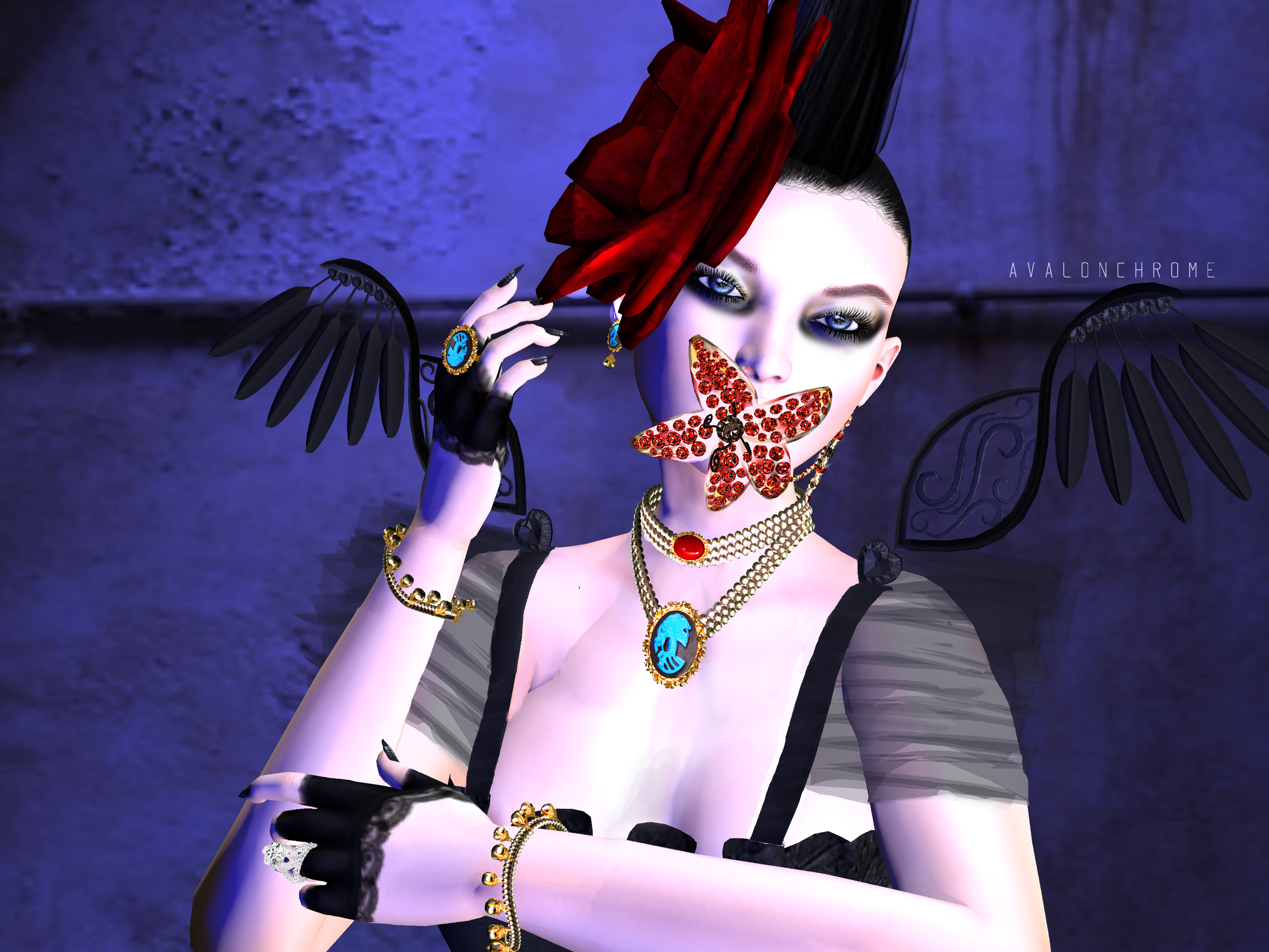 Inspired by this gothic jewellery, I pulled one of my favorite gothic gowns out of my inventory: the Ecate mesh dress by AD Creations. This amazingly detailed and timeless creation comes with wings and offer other options including ruffles and a headband. I’m always happy to find an occasion to wear this fabulously dark ensemble.