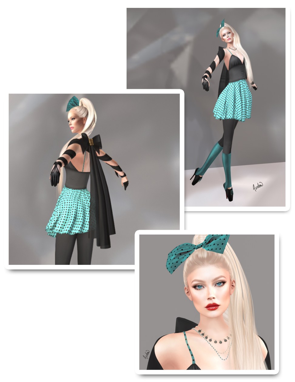 This sassy little number catches the eye with its happy polka dots contrasted by gold accents and a pop of red. The look was created by combining two LUXE Paris outfits: the dress from the LARIMAR set and the decorative sash and arm-wrap from the FABULOUS gown set. Standing on point in her edgy ballet heels, I was ready to strike a pose for the paparazzi as I shopped on the Promenade for my LUXE Paris Met Gala gown.